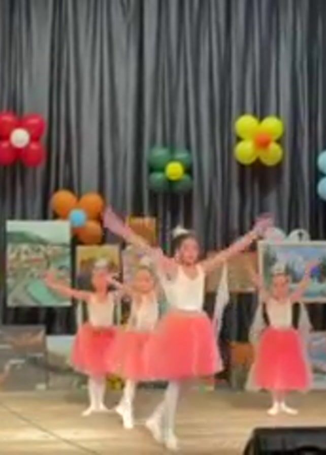 A group of six young girls perform a ballet dance on a stage. The girls are wearing white tops and pink tutus, with their hair styled in buns adorned with white bows. They move gracefully in unison, performing choreographed arm movements. The stage backdrop is a grey curtain, decorated with flower-shaped balloon arrangements in various colors. On the stage floor, framed paintings are displayed, creating a backdrop for the dancers. A microphone stand and a speaker are visible on the stage. The lighting is bright, illuminating the dancers and the artwork.