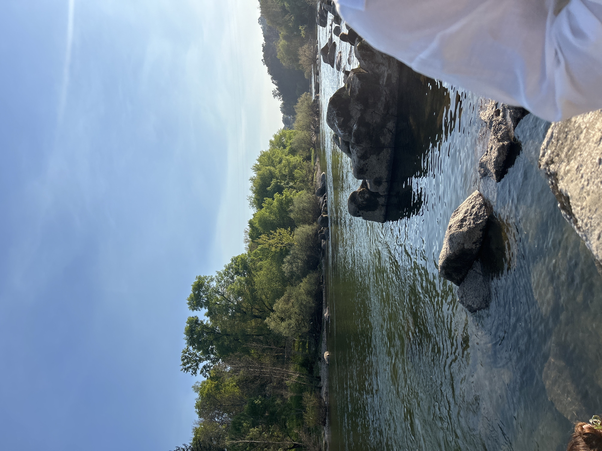 A riverside scene in Amarante, Portugal, depicts a body of water flowing between a tree-lined bank and rocky outcrops. The water is calm with slight ripples and reflections. Smooth, gray rocks of varying sizes are visible both in and beside the water. The vegetation on the bank is dense and leafy. A bright blue sky is overhead. A small part of a white item is visible in the upper right corner.