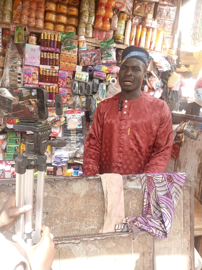 An adult male stands behind a weathered counter within a market stall in Rigasa, Nigeria