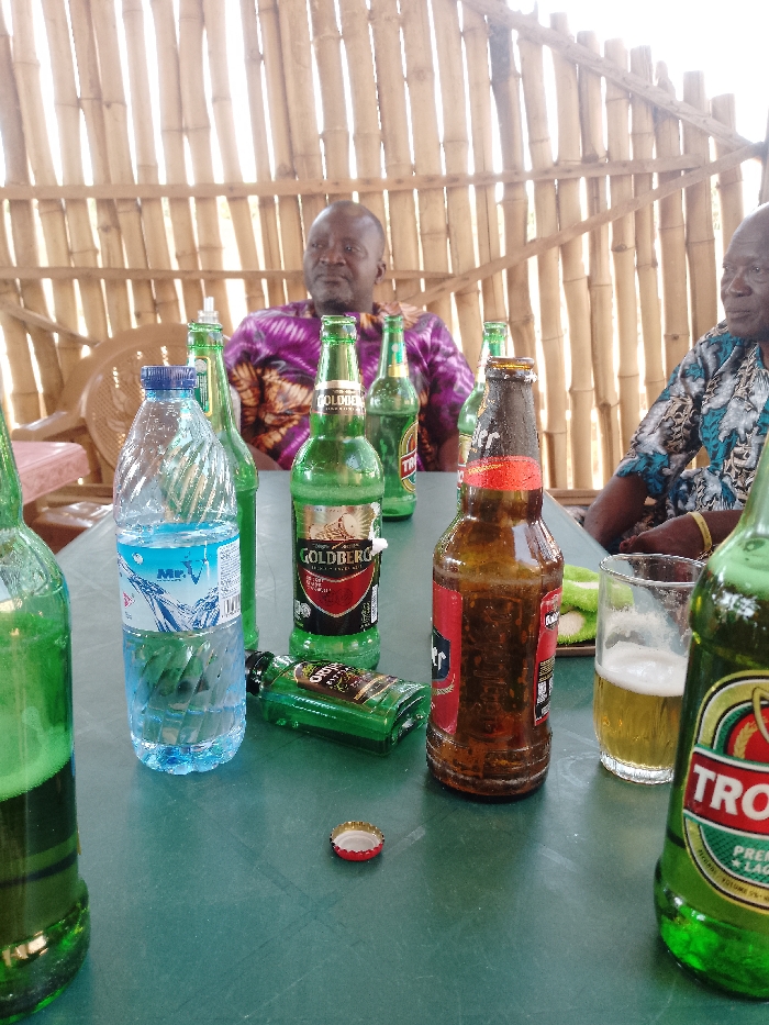 The image depicts an outdoor or semi-open-air establishment in Makera, Nigeria, characterized by a structural enclosure made of vertical bamboo poles. Two adult males are seated at a green table. The man in the foreground, positioned centrally, wears a purple and brown patterned short-sleeved shirt and gazes forward. A second man, partially visible on the right, wears a blue and white patterned shirt. The table surface is predominantly covered with various beverage containers. These include: * Multiple green glass beer bottles, some full, some partially consumed. One prominent green bottle with a black and red label is identified as "GOLDBERG." Another partially visible green bottle on the far right has a "TROPHY" label. * One clear plastic bottle of "Mr. V" bottled water, approximately half-full. * Two brown glass beer bottles, one appearing empty or nearly empty. * A transparent glass containing light amber liquid, consistent with beer, topped with a head of foam. * A small green bottle, likely a spirit or bitters, lying horizontally on the table. * A red and white bottle cap resting on the green table surface. * A plate containing several sliced, light-green, oval-shaped items, possibly garden eggs or similar produce, is visible to the right of the Goldberg bottle. In the background, behind the men, a light brown plastic chair is partially visible, indicating additional seating. The overall scene suggests a social gathering at a beverage-serving venue.