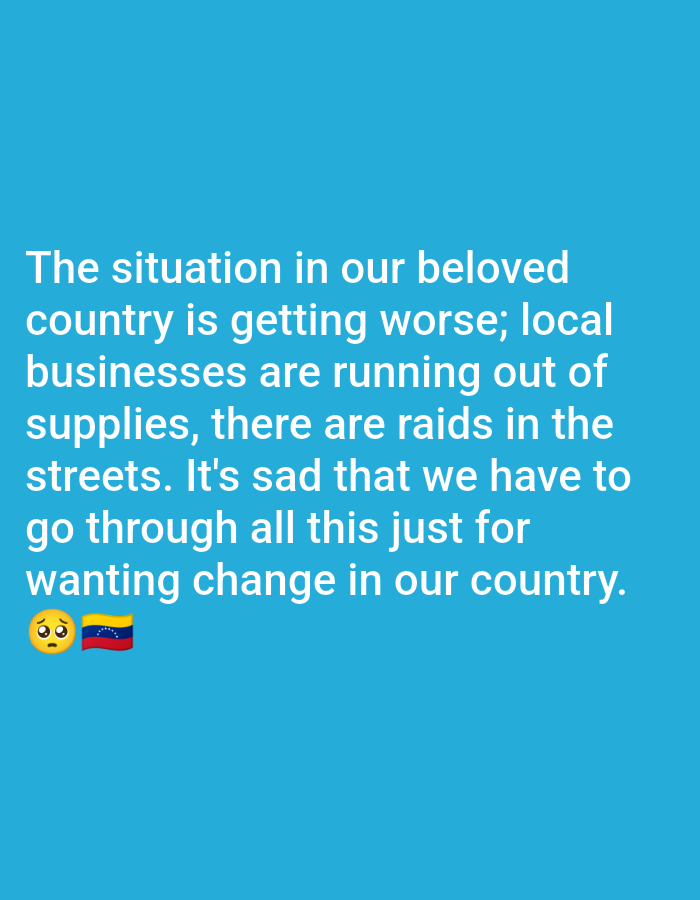statement about a deteriorating situation in a "beloved country." Local businesses are running out of supplies, and street raids are occurring. The author expresses sadness that such hardships are faced for simply wanting change in their country. The text is accompanied by a sad-faced emoji and the flag of Venezuela. The background is a solid light blue color.