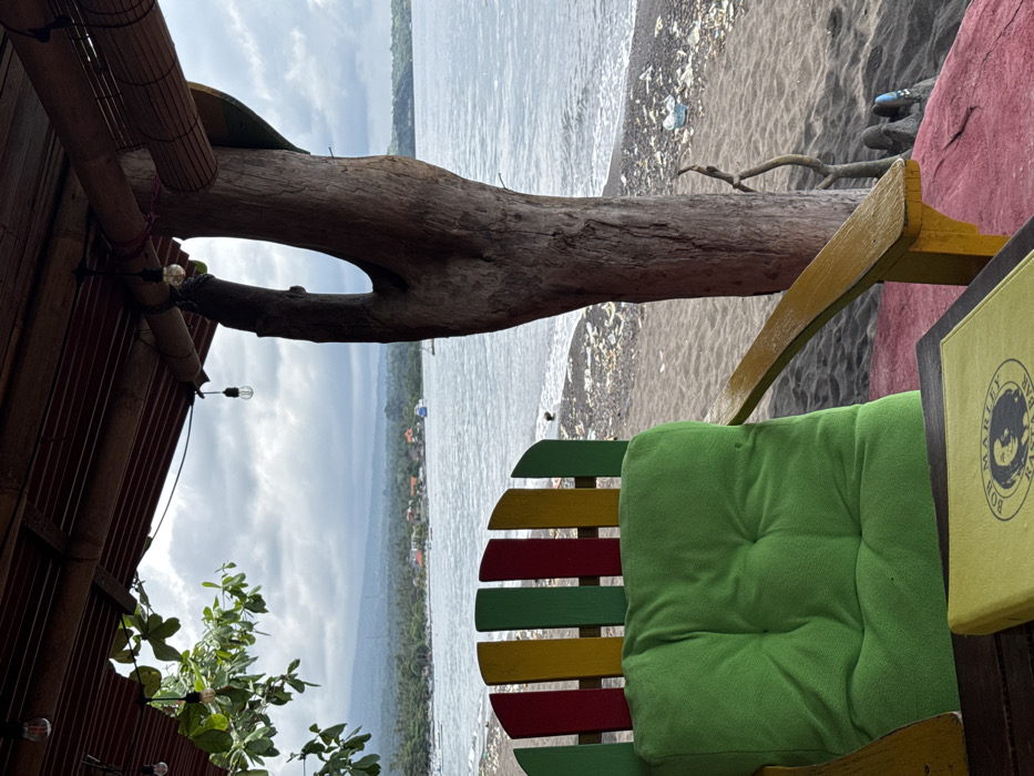 The scene depicts a view from a covered outdoor establishment, likely a bar or cafe, overlooking a dark sand beach and the ocean in Unknown, Indonesia. In the foreground, a wooden Adirondack-style chair is visible, featuring a backrest with vertical slats painted red, yellow, and green, and yellow armrests. A bright green tufted cushion occupies the seat. In front of the chair, a dark wooden table holds a yellow menu or binder displaying "Bob Marley Rasta Bar" with a stylized portrait of Bob Marley. To the right, a large, gnarled tree trunk with a prominent central void serves as a structural support for the overhead roofing. The roof, constructed from wood and bamboo, has exposed incandescent string lights hanging from it. Green foliage is visible near the top left of the frame. The midground features a dark grey/black sand beach, littered with scattered white and colored debris, including plastic items. The calm, dark blue-grey ocean extends beyond the beach. Several boats are visible on the water; a distinct blue boat is positioned centrally, and other smaller vessels are less clearly defined. In the background, a distant coastline is discernible, characterized by scattered buildings with reddish roofs nestled amidst dense green vegetation. Behind this coastline, a range of dark green mountains or hills rises under an overcast sky, which is filled with grey clouds. No people are explicitly visible in the frame.