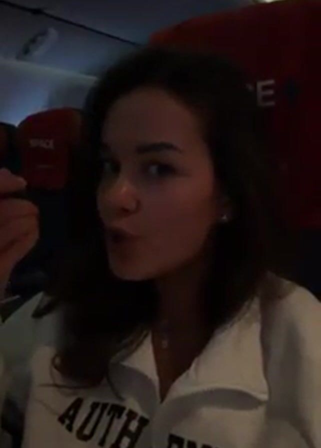 woman seated on an airplane. She has light brown hair and is wearing a white sweatshirt with the word "AUTHENTIC" on it. She eats something from a spoon, then she holds a disposable black stirring stick. The airplane interior is visible, with red seat covers labeled "SPACE." The lighting in the cabin appears dim.