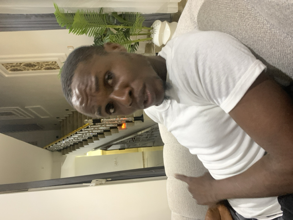 A man in a white t-shirt is angled and pointing towards the lower right of the frame. He has short, dark hair and a beard. He is partially reclined on a gray sofa. Behind him is a staircase with gold railings, leading downward. Artificial greenery stands atop a white, vase-like object in the background. A window frame and curtain partially obscure the left side of the image.