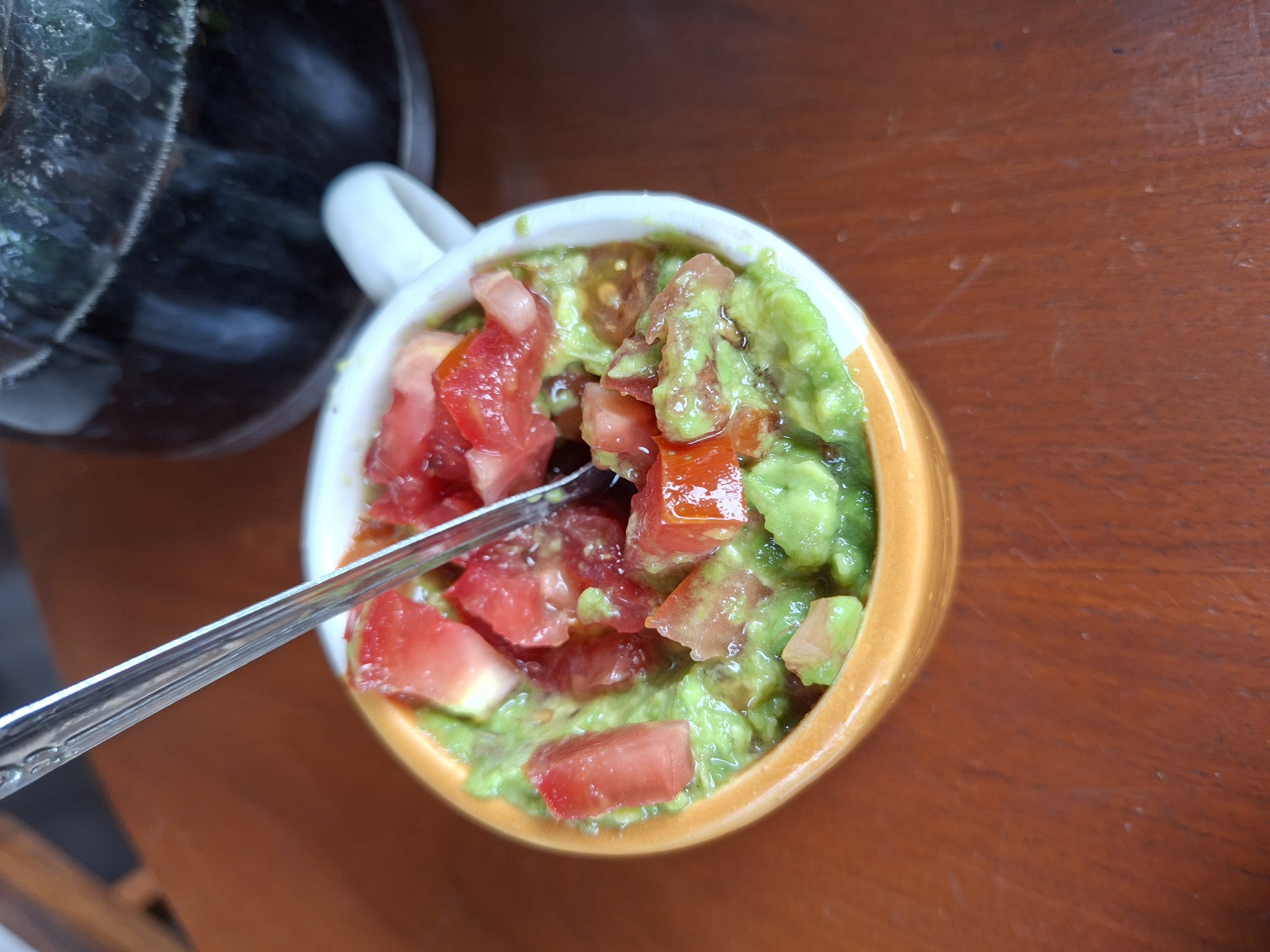 A high-angle, close-up shot shows a cup of guacamole with diced tomatoes on top, with a spoon resting inside, sitting on a wooden table. The cup has a white interior and a tan exterior, and a white handle can be seen on the left. The guacamole is a vibrant green color, and the tomatoes are bright red. The spoon is silver in color, and it is partially submerged in the guacamole and tomatoes. The wooden table has a reddish-brown tone and displays a visible wood grain pattern. In the blurred background to the left, a dark, shiny object is partially visible. The image was taken in the Ubud District, Indonesia.