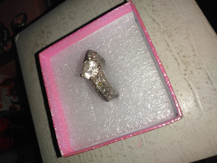 The image displays a silver-toned ring with a prominent, clear, possibly cubic zirconia, solitaire stone set in a four-prong setting