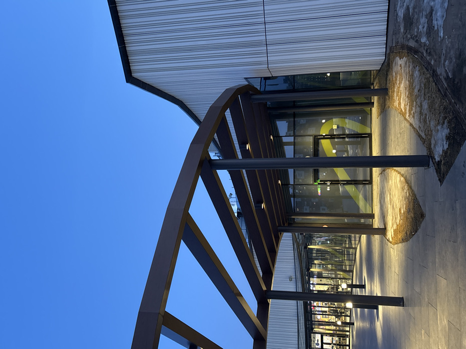 The image displays the exterior of a modern building in Kudrovo, Russia, observed during twilight or early evening under a clear, deep blue sky. A dark brown metal-framed pergola or canopy with embedded downlights extends over a gray paved walkway. This canopy is supported by dark cylindrical columns. To the left, a section of the building features a glass facade revealing illuminated interiors. Centrally, a main entrance with glass double doors is visible, behind which a large yellow, curvilinear graphic or logo is prominently displayed. To the right, an adjacent section of the building exhibits a curved facade clad in vertical, light-colored ribbed panels, topped with a dark-edged roofline. The paved ground is partially bordered by patches of melting snow and exposed earth. Several low-profile, illuminated bollard lights are positioned along the walkway, casting light onto the ground and snow. No individuals or specific activities are visible within the frame.