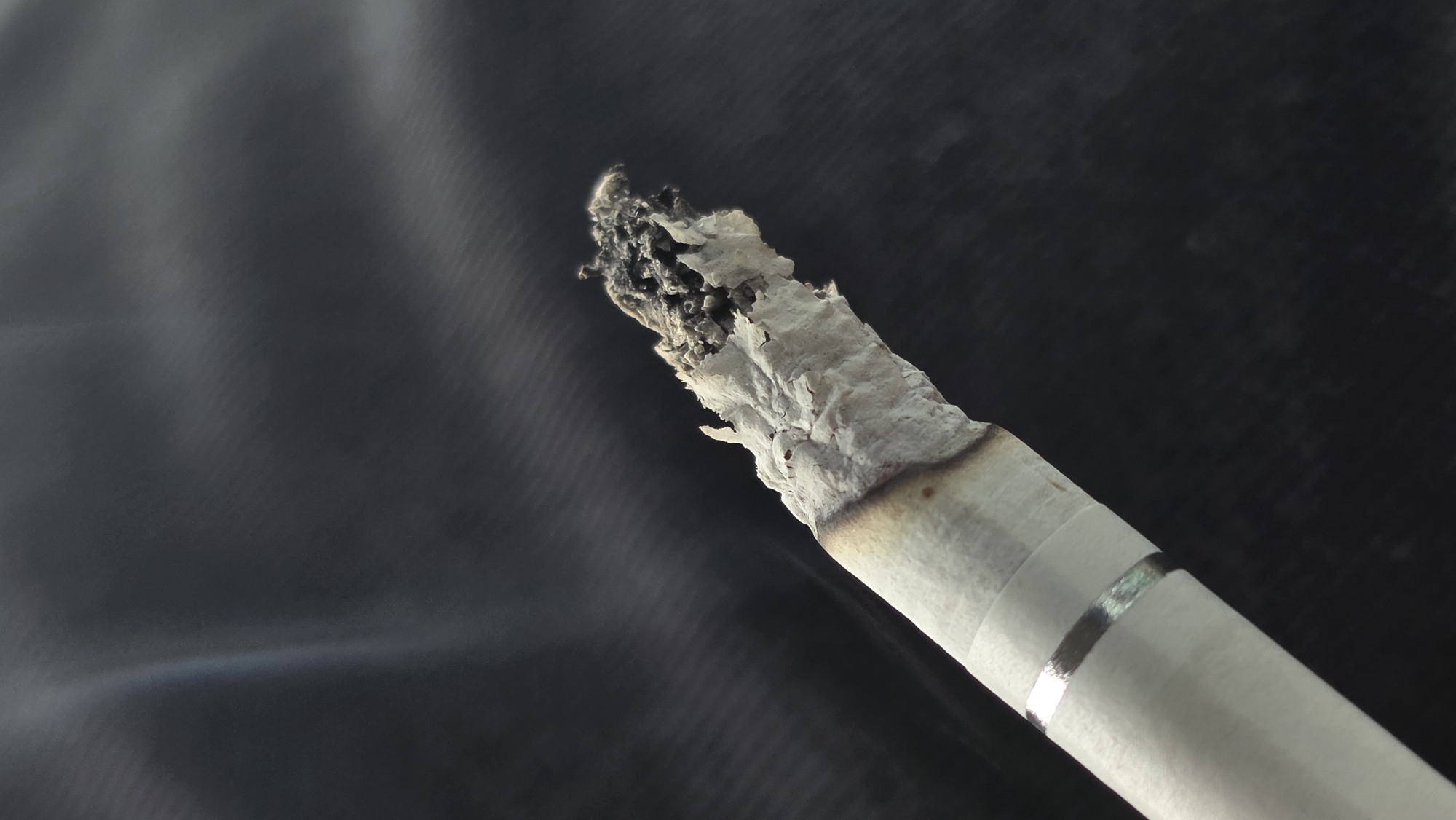 - "A close-up view focuses on a burning cigarette against a dark, out-of-focus background displaying subtle diagonal textures" by FM-3O4tD2, licensed under CC BY 4.0
