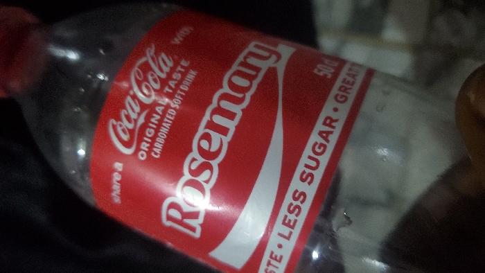 A Coca-Cola bottle with a red label. The Coca-Cola logo is visible, along with the words "ORIGINAL TASTE" and "CARBONATED SOFT DRINK". The bottle also has the name "Rosemary" in large white lettering and states "50d". Underneath "Rosemary", it says "TASTE LESS SUGAR. GREAT". The bottle is partially empty and slightly blurry.