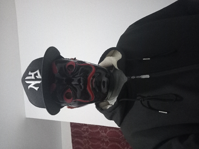 A person is wearing a black and red mask, a black baseball cap with white embroidery, and a black hooded jacket
