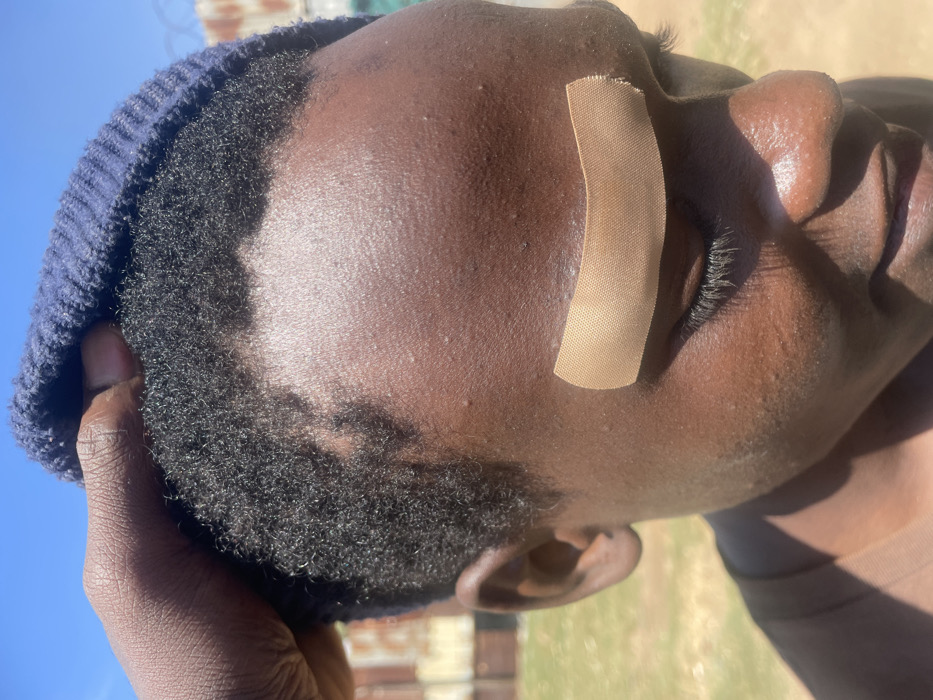 An outdoor, brightly lit, close-up photograph taken in Bukuru, Nigeria, depicts the left profile of an individual with dark skin. A beige adhesive bandage is horizontally affixed over their left eyebrow and partially over the closed left eye. Short, dark, kinky hair is visible, with patches of depigmented skin or scarring along the hairline of the left temple. A dark blue knitted beanie partially covers the head. A second individual's dark-skinned hand is visible, holding and slightly lifting the beanie from the subject's scalp above the left temple. The subject's forehead exhibits small, raised skin imperfections. The background is blurred, showing a clear blue sky, dry ground, and structures consistent with weathered, corrugated metal sheets, indicative of an urban or semi-urban environment under direct sunlight.