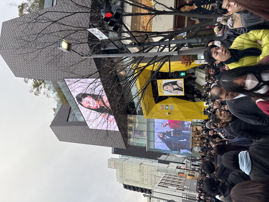 The image captures a densely crowded street scene in Shibuya, Japan, under an overcast sky. In the foreground and midground, a large group of pedestrians, primarily East Asian individuals, occupies the sidewalk and street, moving generally forward. Most are dressed in various coats and jackets, suggesting cool weather; some individuals wear face masks. In the background, tall, modern buildings dominate the skyline. A prominent building on the right features a dark, textured facade with a scale-like pattern and a green, possibly rooftop garden. This building displays a large LED screen depicting a woman with dark hair in a yellow top, advertised with "d'Alba" branding. Below this, a second large LED screen shows two individuals, a man and a woman, with "WY M" text partially visible. A distinctive bright yellow, geometric archway structure serves as an entrance to a plaza or building, with stairs visible leading upwards. Hanging from this structure is a banner featuring another image of a woman, possibly for "d'Alba," making a peace sign. A black pole with a street lamp extends into the frame from the right, supporting a traffic light fixture displaying a red light for vehicles and a green light for pedestrians, indicating current pedestrian crossing. Bare-branched trees are scattered throughout the scene, further suggesting a non-summer season. A street sign in Japanese, "神宮前" (Jingumae), is visible on the pole. Other buildings, including one labeled "Fender," are visible further down the street in the left background.
