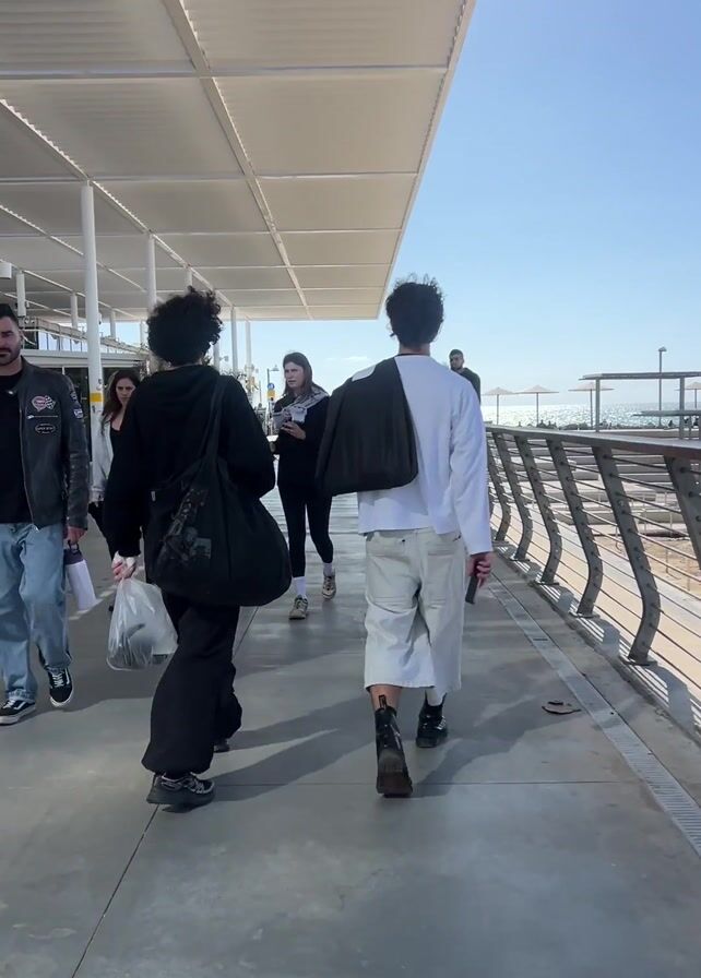 group of people walking along a covered walkway near a waterfront. The walkway has a gray concrete floor and is lined with a metal railing on the right side. On the other side of the railing, the ocean can be seen under a clear blue sky. The main focus is on two people walking away from the camera. The person on the left wears a black hoodie, baggy black pants, and carries a black bag and a plastic bag. The person on the right wears a white long-sleeved shirt, light-colored shorts, and carries a dark jacket over their shoulder. Other people are walking in the same direction. Some are visible in the background, and some pass by in the opposite direction. There are also people standing by the railing, looking out at the ocean. The walkway is covered by a white, geometrically patterned roof, supported by white columns. The overall environment appears to be a modern, public space, possibly a pier or a promenade.