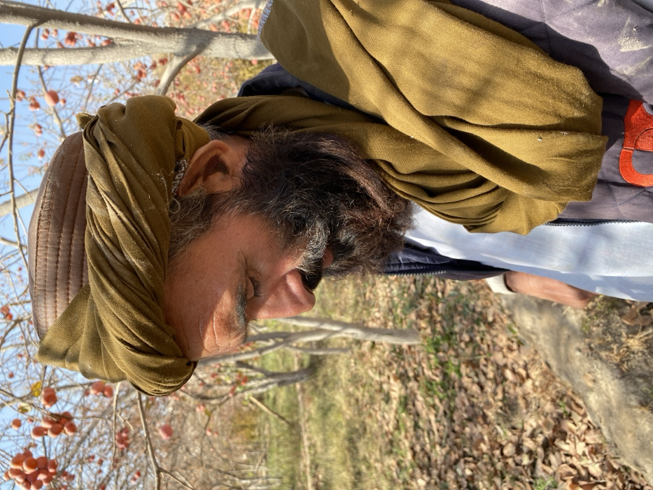 In Bazar-e Panjva'i, Afghanistan, a medium close-up portrait captures a male individual in profile, facing left with his gaze directed downwards. He has a dark, full beard with visible grey hairs and a mustache. He wears a structured brown cap wrapped with an olive-green fabric turban. An olive-green scarf is draped over his shoulders and around his neck. He is dressed in a light-colored collared garment beneath a dark, possibly quilted, outer jacket or vest. A silver-colored ear cuff or ornament is visible on his left ear. The background features an orchard or cultivated area under a clear blue sky, with rows of deciduous trees displaying bare branches. Some trees are still laden with reddish-orange, spherical fruit. The ground is extensively covered with dry, brown fallen leaves, and a low, irregular earthen or concrete barrier runs horizontally across the mid-ground.