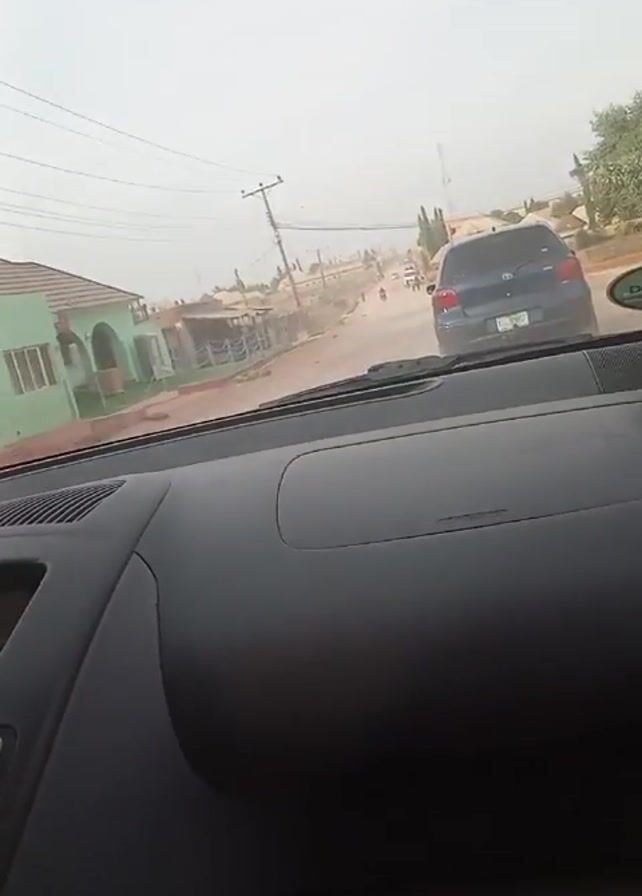 A video taken from inside a car shows the view through the windshield. The car is driving down a dirt road in a residential area. The road is unpaved and dusty. There is a blue car ahead of the car taking the video, and a motorcycle passes on the side of the road. There are houses and buildings on either side of the road. The sky is overcast. The dashboard of the car taking the video is visible.
