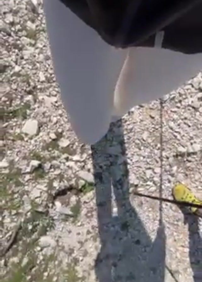 A person is hiking on a rocky terrain near a cliff edge, wearing white sneakers, light gray pants, and a black top. The camera angle is looking down at the hiker's legs and the ground, capturing their shadow and a walking stick. The terrain consists of small rocks, pebbles, and patches of grass. As the camera angle changes, the view shifts to reveal a steep, rocky cliff face and a glimpse of the blue sky below. The hiker is standing near the edge of the cliff, highlighting the depth and scale of the natural landscape.