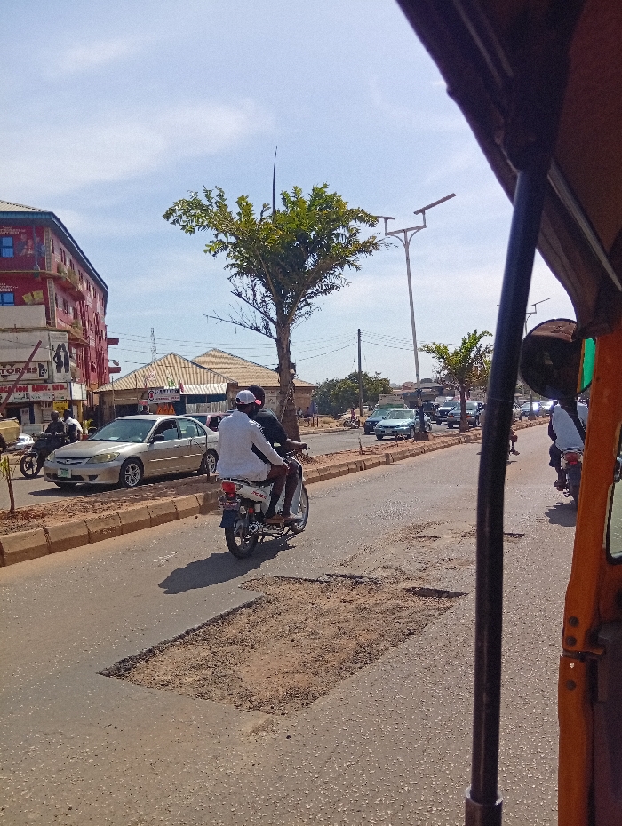 The image depicts a daytime street scene in Rafin Par, Nigeria, captured from the interior of an orange-framed vehicle, likely a tricycle, with a black vertical support bar visible on the right. The asphalt road surface features multiple large, rectangular potholes, with a prominent one in the foreground measuring approximately 1.5 meters by 1 meter, exposing sandy soil. Two individuals are riding a white motorcycle with red accents, traveling away from the viewer in the left lane. The driver wears a white long-sleeved top, dark trousers, and a white helmet. The passenger wears a dark top and lighter trousers. Their shadows are cast on the road to the left. To the left of the motorcycle, a light-colored sedan (possibly gold or silver) is parked or moving slowly. Behind it, another motorcycle is visible. A concrete median separates the lanes of traffic. On the left side of the road, a multi-story building with a red facade and blue-tinted windows is visible, displaying signage (e.g., "STORES"). Single-story buildings with light-colored roofs are present further in the background. In the center-left, a tree with green foliage stands next to the road. To the right, a tall street light with multiple solar panels is visible. Further down the road on the right, additional vehicles are present in the opposing traffic lane. The sky above is clear blue with scattered white clouds. Utility poles and overhead wires are visible in the background.