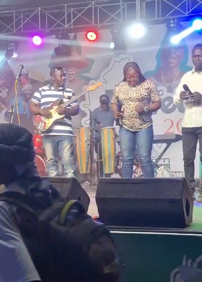 band performing live on a stage. There are at least seven people visible on stage. A man on the left is playing a guitar. A woman in the center is singing into a microphone, and a man to her right is also singing into a microphone. Behind them are a drummer and a percussionist playing conga drums. There are also other musicians on stage. The stage has a backdrop with images of people and the number 202. The stage is lit with bright spotlights of different colors. There are large speakers on the front of the stage. In the foreground of the video, there is a person with a camera filming the performance. The environment appears to be an outdoor event or festival.
