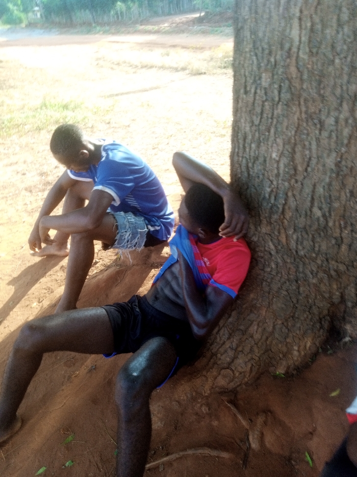 Two young men sit under a tree on bare ground. One, in blue shorts and a blue shirt, sits with bare feet, head bowed. The second leans against the tree with bare legs, and a red shirt. Both appear fatigued. The ground is bare and brown, the tree has thick bark. The background is indistinct.