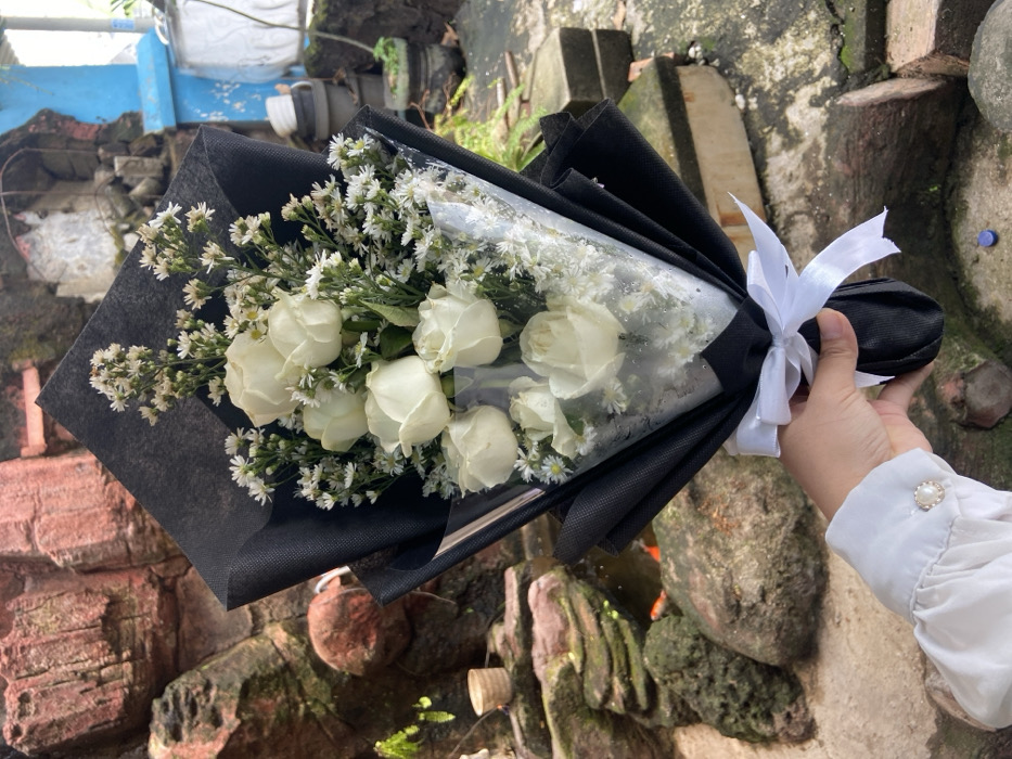 A bouquet of white roses and baby's breath, wrapped in black fabric and clear plastic, is held in a hand wearing a white, long-sleeved shirt with a pearl button