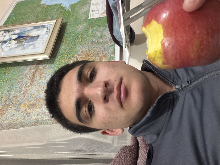- "A young adult male is depicted in a medium shot, centered and facing forward, holding a partially consumed red apple in his right hand" by FM-aaonr2, licensed under CC BY 4.0