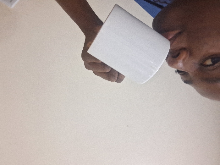 The scene is located in the city of Close, Nigeria. A dark-skinned individual, gender indeterminate, is visible in the left portion of the frame. Their lower face, including the nose and pursed lips, is in direct contact with the rim of a plain white, cylindrical mug. The individual's right hand grips the mug. A blue garment is visible on the upper left, possibly part of a collar or uniform. The background consists of a uniform, light-colored wall with minor textural variations, indicating an indoor environment. The individual is engaged in the act of drinking from the mug.