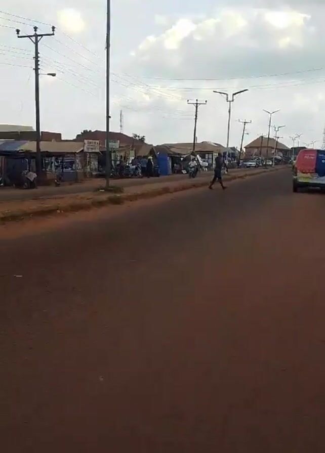 A handheld camera captures a scene from a slightly elevated position, looking down a road in what appears to be a small town. The road surface is a reddish-brown color. On the left side of the road are small shops or stalls. People can be seen walking around and interacting with the stalls. Power lines stretch across the sky above the road. A man walks across the road, and a colorful van is parked on the right side. In the background, more buildings and trees can be seen. The sky is cloudy, suggesting overcast weather.