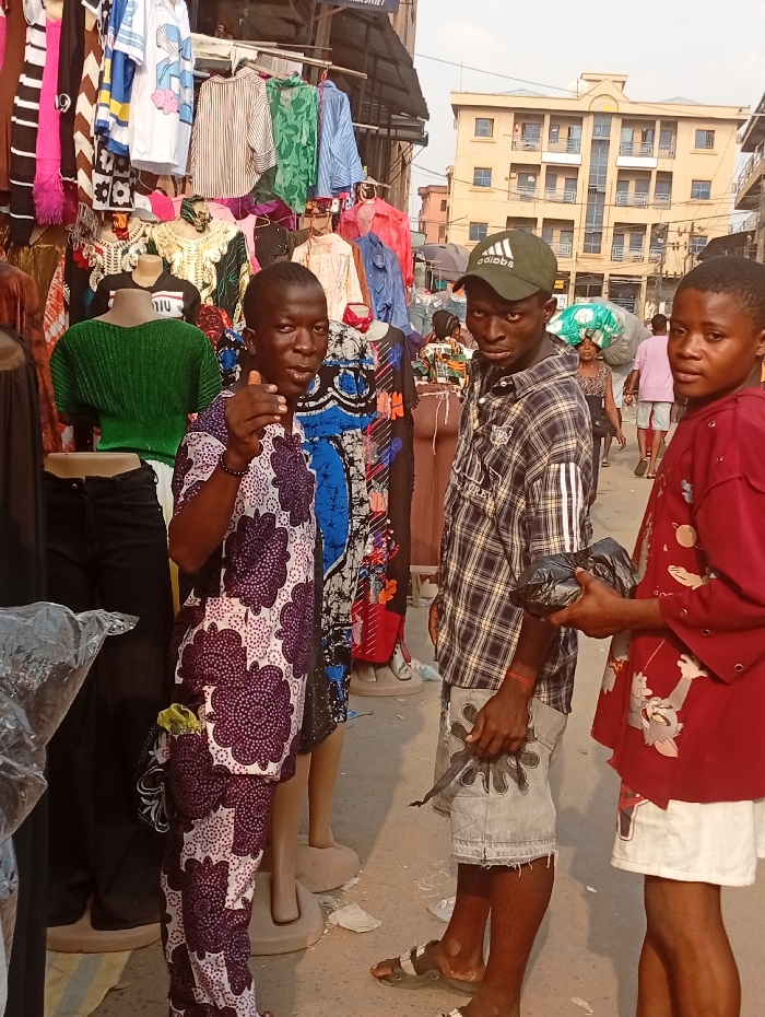 The image depicts a street market scene in Nkwelle, Nigeria