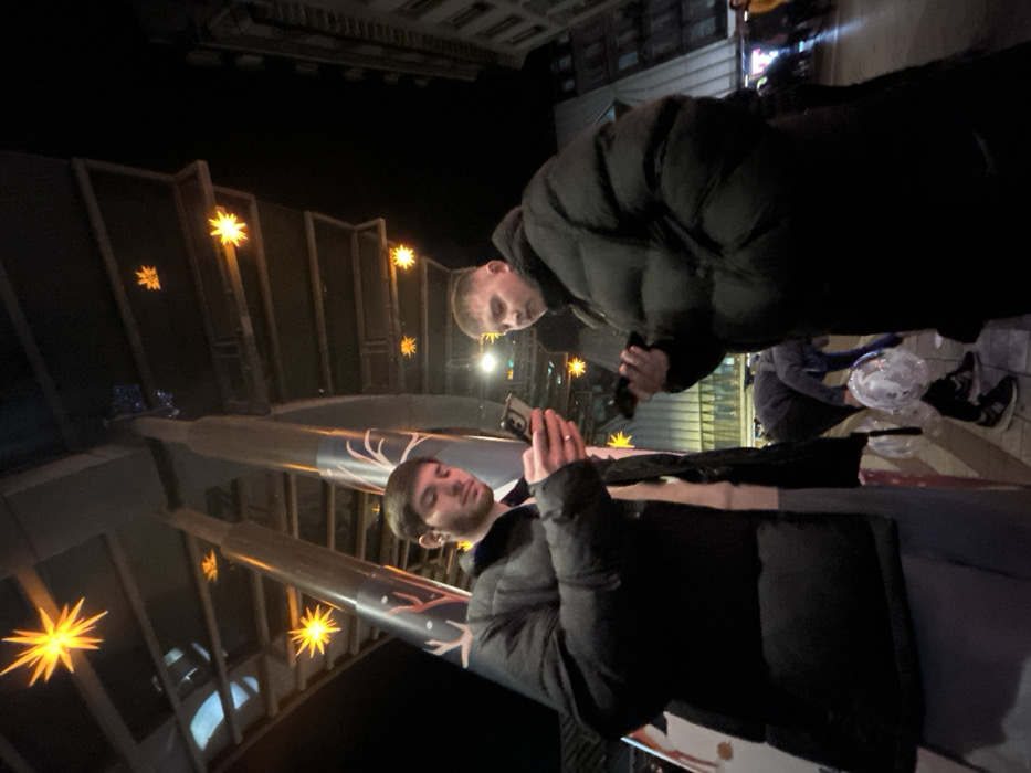 Two men are looking at their phones at night. Both are wearing dark winter jackets. The man in the foreground is in the lower center of the frame, and the other man stands above him. The background consists of bridge support structures decorated with star-shaped lights and a dark night sky above. There are other people behind them as well.