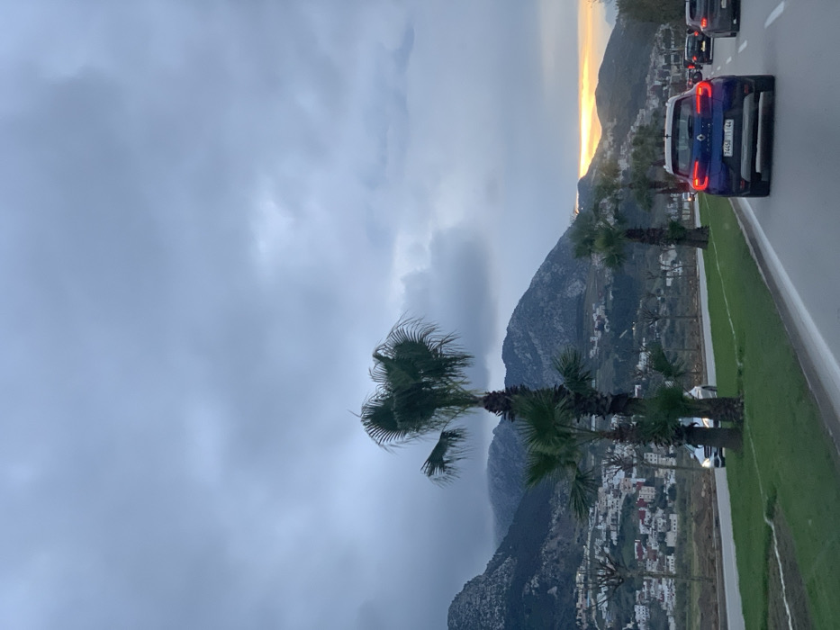 The image captures a major road in Tétouan, Morocco, during dusk under an overcast sky