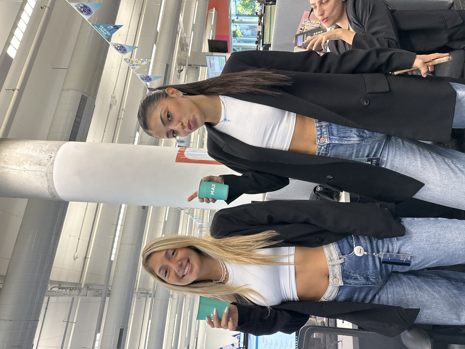 The image displays three individuals within a brightly lit, open-plan office environment in Bnei Brak, Israel. The background features cubicle workstations, computer monitors, and an industrial-style ceiling with exposed HVAC ducting, from which blue and white decorative banners with Hebrew text and symbols are suspended. In the foreground, two young adult females are posing. The female on the left, with long blonde hair, smiles and holds a turquoise cup with a white heart decal in her right hand. She wears a white crop top, light blue jeans with a gray upper waistband, a black blazer, a white beaded necklace, and a belly button piercing; a retractable ID badge is clipped to her jeans. The female on the right, with dark hair pulled into a high ponytail, makes a pouting expression while holding a turquoise cup bearing the text "MAX" in white letters in her left hand. She wears a white crop top, light blue jeans, a black blazer, and a silver necklace with a small blue charm. In the far right background, a third individual, partially visible, reclines in a chair while holding and looking at a smartphone.