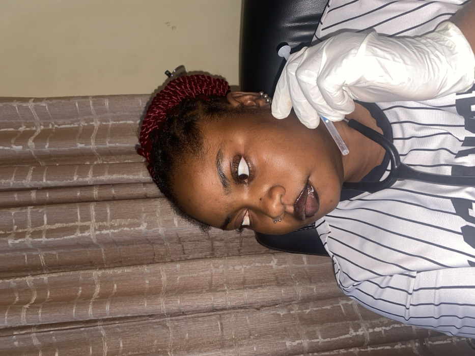 A dark-skinned woman lying on a brown, textured surface wears a white, striped shirt, a stethoscope, and has red braids. A gloved hand holds a syringe near her face. She has multiple piercings on her ear and a lip ring. The woman is looking toward the syringe, and her eyes are wide. She is leaning back in a black chair. A plain, tan wall is visible in the background.
