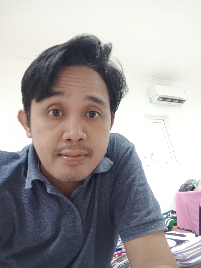 A male individual, appearing to be an adult of Southeast Asian ethnicity, is depicted in a close-up, chest-up shot. He possesses dark hair, styled with volume on top, and exhibits a thin mustache and light stubble on his chin. His eyes are wide, directly engaged with the camera, and his lips are slightly parted. He wears a blue-grey short-sleeved polo shirt with a three-button placket, with one button fastened. The background reveals an indoor setting with white walls and a white ceiling. A white split-unit air conditioner is mounted high on the wall in the upper right section. Below the air conditioner, a portion of a white-framed window or interior door is visible. In the lower right corner, below the individual's arm, a surface is draped with pink fabric, upon which a grey motorcycle helmet and other indistinct objects are placed. Further down and to the left, a stack of papers or magazines with visible text and graphics is present. The scene is an indoor room, likely an office or personal dwelling. While no specific landmarks or unique architectural features are visible to definitively identify the city as Semarang, Indonesia, the environment is characteristic of a contemporary indoor space in an urban setting.