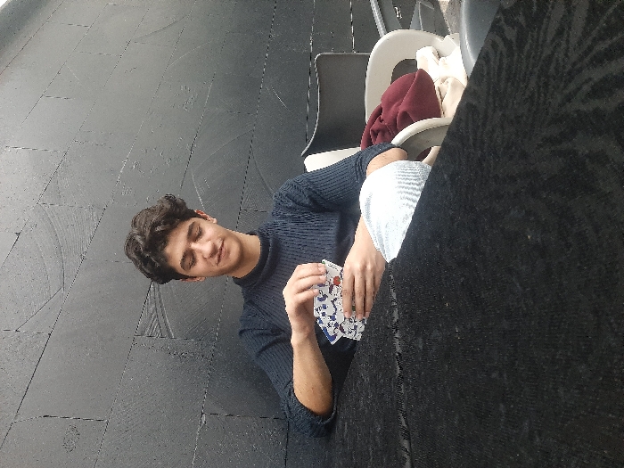 - "A young man with dark, curly hair and a navy turtleneck sweater sits at a table, holding playing cards in his hand" by FM-J2D4h2, licensed under CC BY 4.0