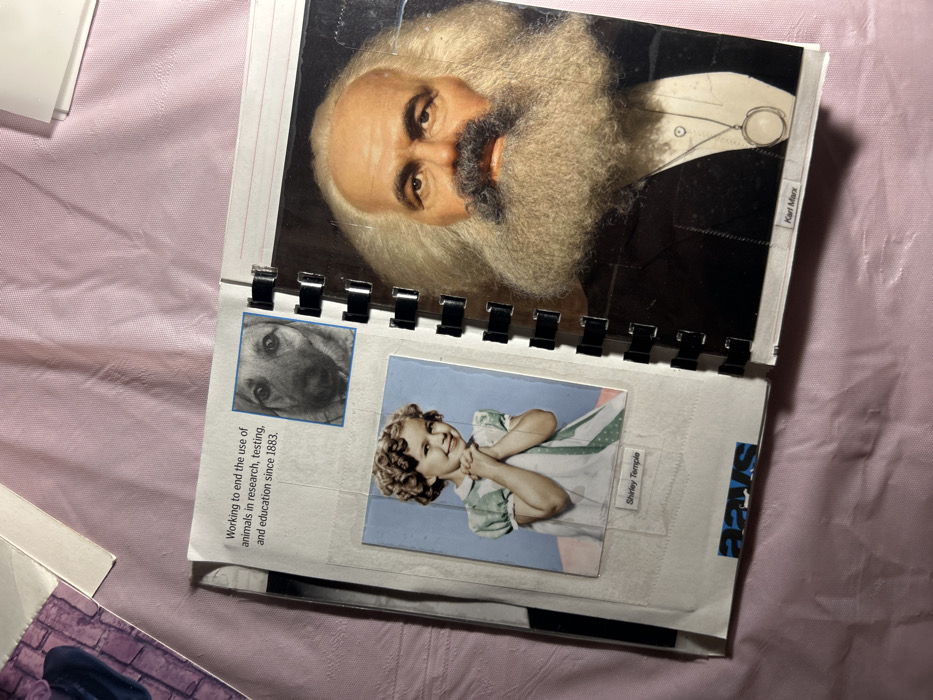 A spiral-bound notebook displays a collage of images and text. Karl Marx’s portrait dominates the top page. Below, an image of a dog is placed near text about ending animal testing and research since 1883. A cutout picture of Shirley Temple is taped next to that. "Karl Marx" and "Shirley Temple" are written near their respective images. A partially obscured word ending in "aaus" appears near the edge.