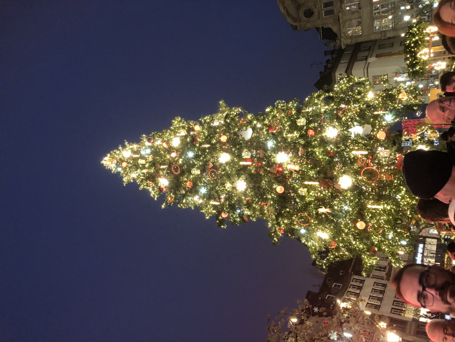 A brightly lit Christmas tree dominates the frame against a dark blue sky. Ornaments and lights adorn the tree. Buildings line the right side of the tree. People, partially visible, are standing near the base of the tree. The photograph is oriented sideways.