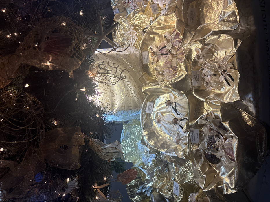 The scene features a decorative Christmas tree adorned with lights, netting, a starfish, and various shell-themed ornaments. Adjacent to the tree are displays of sea shell angel ornaments on metallic gold fabric, arranged in individual compartments. Small price tags are visible on several ornaments. The ornaments and tree have a coastal or nautical aesthetic.