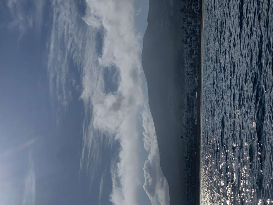 The image displays a coastal view of M'diq, Morocco, observed from the sea. The foreground consists of dark blue water with ripples; direct sunlight creates shimmering reflections across the left half of the water's surface. A strip of sandy beach is visible along the coastline, bordered by numerous light-colored buildings and structures, characteristic of a town or resort area. Behind these structures, a large, dark mountain range rises, its slopes appearing vegetated. The sky above is partially covered with white and grey cumulus clouds, with patches of clear blue sky visible. A lens flare or sunbeam is present in the upper left quadrant of the sky. No individuals or specific activities are discernible.