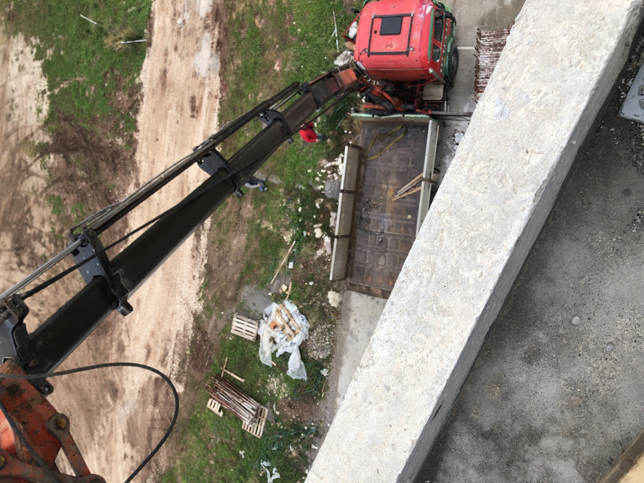 This image depicts an elevated view of a construction site in Čanj, Montenegro. In the immediate foreground, a rough-textured concrete beam or wall, part of an unfinished structure, extends diagonally from the lower left to the mid-right. Below this, a concrete floor is visible. The scene below shows an active construction area. A red truck with an attached crane boom is positioned towards the lower right. The crane's dark-colored boom extends upwards and diagonally across the frame, with its hydraulic components visible. The truck's cab is red, and its flatbed appears to be empty, showing a dark, possibly metallic, surface. Two individuals are present on the ground. One person, wearing a blue shirt, is partially visible beneath the crane boom, near a dirt path. Another person, wearing a red shirt, is closer to the truck, near the base of the crane. The ground environment consists of a mix of dirt paths, patchy green grass, and areas of disturbed soil. Scattered construction materials and debris are visible, including several wooden pallets, some stacked with other items, and pieces of white plastic sheeting. To the left, a stack of what appears to be metal scaffolding poles rests on wooden pallets. The overall impression is an active, open-air construction or demolition site.