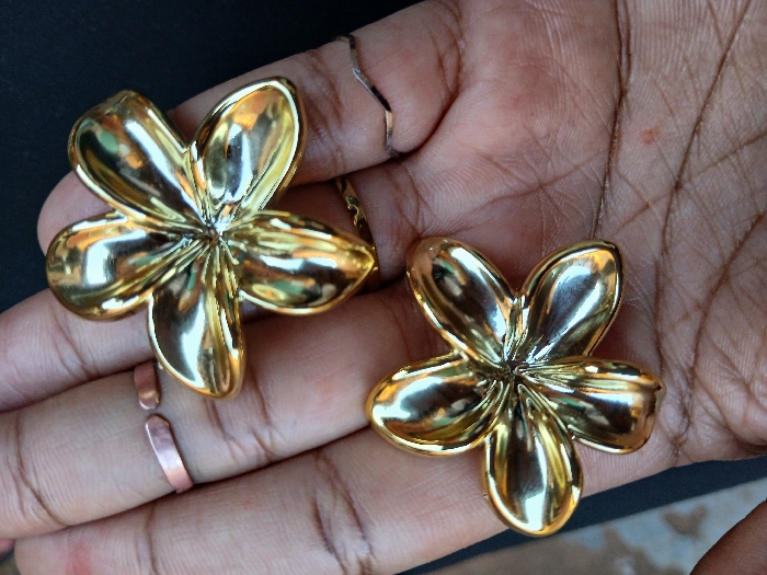A human hand, consistent with an adult of medium-dark complexion, is centrally positioned, palm open, holding two identical gold-colored, five-petal, metallic flower-shaped objects