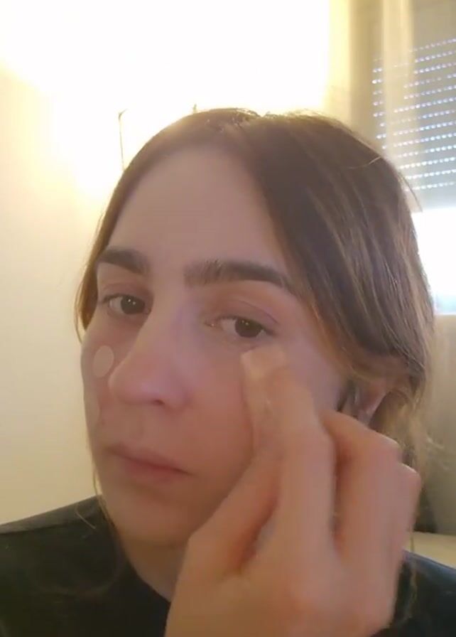 A person with light brown hair is close to the camera, applying a beige cosmetic product to their face