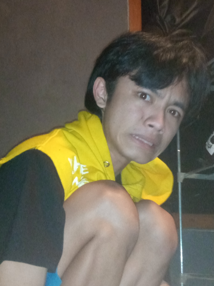 An individual is depicted indoors, in what is identified as Ciherang, Indonesia. The person, a male with dark, medium-length hair, is seen in a squatting or crouching position, facing directly towards the camera. He wears a bright yellow hooded top, partially obscuring a black short-sleeved garment on his left arm. White text is visible on the left chest area of the yellow top. His facial expression shows wide, focused eyes, a slightly open mouth, and a furrowed brow, indicating potential surprise, discomfort, or concentration. A portion of his light-skinned legs and a small strip of blue fabric are visible. The background consists of a dark brown or grey wall to the left and a darker, less distinct area to the right, where a vertical metallic structure, possibly part of a furniture frame, is partially discernible. A thin vertical orange-brown strip is present on the upper right background. The scene is illuminated by dim, ambient lighting.