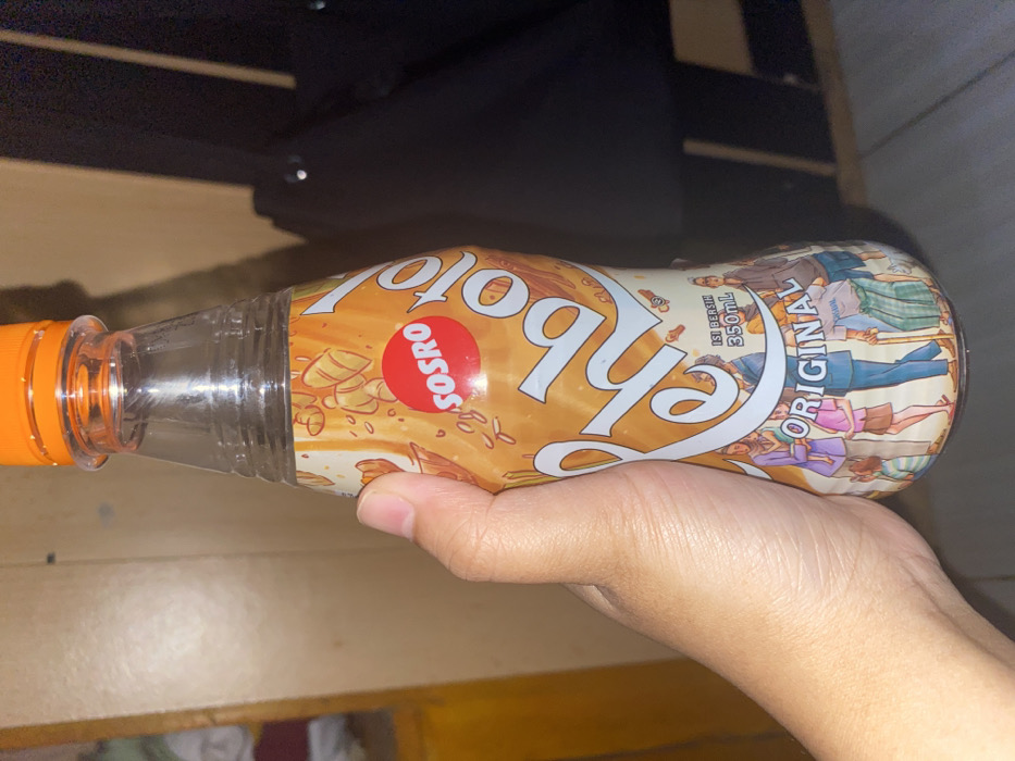 A clear plastic bottle of "Tehbotol Sosro Original" with an orange screw cap is held by a hand