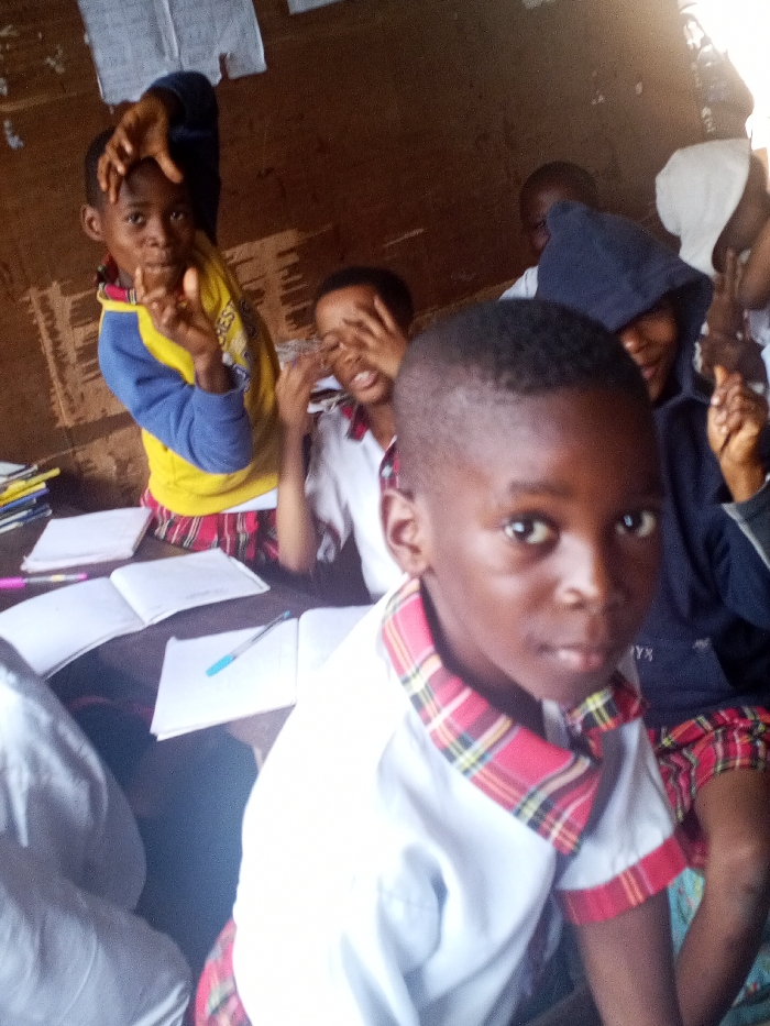 The image displays an indoor scene in the city of Unknown, Unknown, featuring six school-aged children. In the immediate foreground, a boy with a dark complexion and short, dark hair wears a white short-sleeved shirt with a red and green plaid collar and cuff trim; he gazes directly towards the viewer. Behind him and to the left, another boy in a yellow and blue long-sleeved shirt with a plaid collar stands, making hand gestures in front of his face. To the right of the standing boy, a third boy, clad in a white shirt with plaid trim, is seated, covering his eyes with both hands. Further to the right and partially obscured, a child wearing a dark blue hooded sweatshirt and red plaid bottom garment is visible, making a hand gesture. Another child, largely obscured, appears to the far right with a white head covering. Multiple dark-colored desks are present, supporting open notebooks, loose papers, and writing implements including a light blue pen and a pink marker. A stack of books or notebooks is visible on the far-left desk. The background consists of rough, brown-toned walls, possibly constructed from wood or cardboard, with several papers affixed to the upper left section. Natural light illuminates the scene from the upper right.
