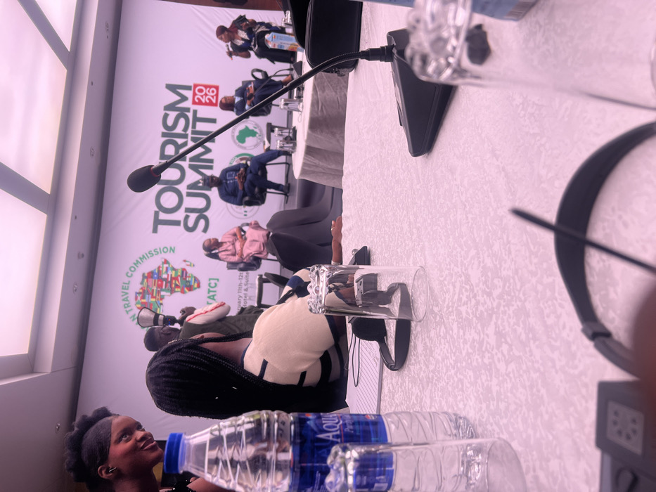 This image captures an indoor event, likely a conference or summit, occurring in Nigeria, identified by the "NIGERIAN TRAVEL COMMISSION" banner; the specific city of Itirin is not discernible from the visible information. The foreground features a white, patterned tablecloth with two bottles of "Aqua Purified Drinking Water," three clear drinking glasses (two inverted), and black wired headphones. A black microphone on a stand points towards the stage. To the left, a person with braided dark hair is seated with their back to the camera, wearing a light-colored top with dark shoulder stripes. Adjacent to them, a woman with dark, styled hair and a dark top smiles while looking towards the right, engaging with an unseen individual. In the mid-ground, a man in a light shirt and dark vest stands, holding a black megaphone, facing the stage. The background reveals a raised stage with a large white banner displaying "NIGERIAN TRAVEL COMMISSION [ATC]" with an African map logo, and "TOURISM SUMMIT 2026" along with "February 11th - 12th Hotel & Suites." Four individuals are seated on the stage, forming a panel. From left to right: a woman in a pink traditional outfit, a man in a blue traditional outfit, a woman in a dark outfit, and another woman in a dark outfit actively speaking into a microphone with her left hand slightly raised. Green and white circular logos are also visible on the banner behind the panelists. The overall environment is well-lit, indicative of a professional indoor event space.