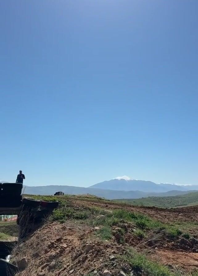 Here's a brief description of the video: The video shows a man on a dirt bike performing a jump over a small ramp made of tires and a platform. The jump takes place in a rural setting with a mountainous backdrop under a clear blue sky. After the jump, the camera pans to reveal three men identified as "Security Police" walking towards the ramp.