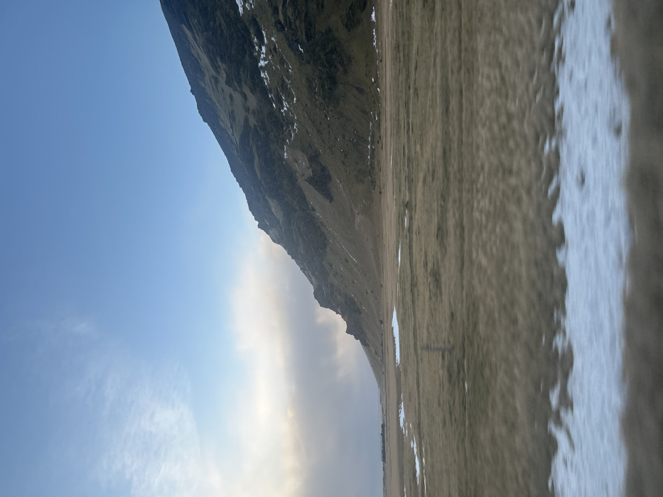 The image presents a wide view of a natural landscape in Skeiðflötur, Iceland, characterized by a vast plain transitioning to a mountain range under a partially clouded sky. The foreground is dominated by a flat expanse of dormant, light brown and tan grasses or tussocks, interspersed with several irregular patches of white snow and ice. A blurred band of white snow or ice occupies the bottom edge, indicating potential motion during capture. A single, slender, dark vertical post, likely a fence post, is visible in the middle ground, slightly left of the image center. In the distant left, at the base of the receding land, a faint cluster of dark, low-lying structures is discernible. The right half of the image features a steep, dark green and brown mountain slope with visible rock formations and scattered white snow patches, particularly in depressions. The sky transitions from a clear, light blue at the top to a hazy, lighter blue-white towards the horizon on the left, where a band of diffuse, light grey and white clouds obscures the far distant landscape. No individuals or active interactions are present in the scene.