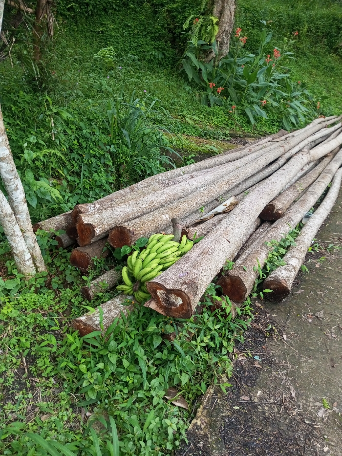 The scene, located in Hasanparthy mandal, India, depicts an outdoor environment primarily composed of natural elements and processed lumber. In the foreground and midground, a substantial pile of freshly cut, debarked logs is stacked horizontally. These logs vary in diameter and length, exhibiting light greyish-brown exteriors and darker brown heartwood at their visible cross-sections. A large, unripe bunch of green bananas rests atop one of the lower logs within the pile. To the left of the log pile, two slender tree trunks with pale bark stand vertically. The ground surrounding the logs and extending into the background is covered with dense, vibrant green vegetation, including various grasses, ferns, and broadleaf plants. In the background, additional trees and plants with reddish-orange flowers are visible. The lower right portion of the image shows a segment of a dark, damp concrete or compacted dirt path. No individuals or active interactions are present in the frame.