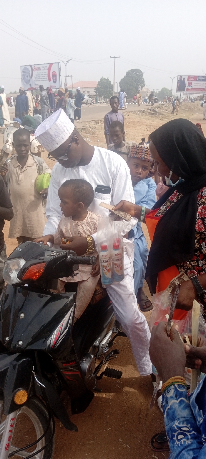 A street scene in Kofar Ruwa, Nigeria, under a bright, hazy sky depicts an interaction around a motorcycle. A dark-skinned man, wearing a white kaftan, a white kufi cap, and sunglasses, is seated on a black "Salti" brand motorcycle. He holds a young child, a toddler in a light-colored top, in front of him on the motorcycle. A second child, dressed in light blue with a patterned cap, is partially visible behind the toddler. A clear plastic bag containing two "Olivia Active" branded bottles hangs from the motorcycle's handlebars. The man is engaged in a transaction with a dark-skinned woman, who wears a black hijab and a floral patterned top. Her right hand extends a wad of folded Nigerian Naira notes, while her left hand holds a clear plastic bag containing multiple light-colored sticks, consistent with items for sale. The ground consists of reddish-brown dirt. In the background, numerous individuals, predominantly men and children in traditional attire, populate the area. A boy carrying a green bowl stands to the left of the motorcycle. The scene extends to a street with distant vehicles, more pedestrians, buildings, and two prominent billboards. One billboard on the left displays political figures and text, including "SWADO DILALE ZAMANI." A billboard on the right mentions "CAPITAL CITY UNIVERSITY KANO." Overhead power lines and poles are also visible.