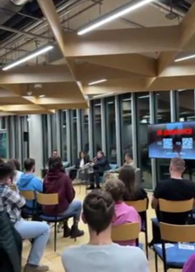 n audience seated and listening to a panel of four people during what appears to be a discussion or presentation. The panel members are seated on chairs at the front of the room. The audience is seated in rows of chairs facing them. The audience includes people of different ages and genders, with varied clothing. A screen behind the panel displays text and QR codes. The room has a modern design, featuring a high ceiling with wooden beams, a large window, and artificial lighting. The overall setting suggests an educational or community event.